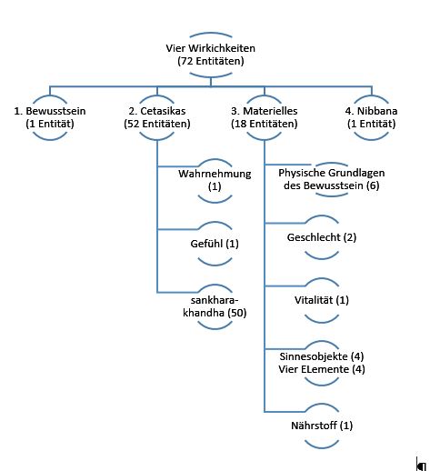 Im Mittelpunkt oder besser noch an erster Stelle unserer bedingten Existenz steht eine Entität Bewusstsein als paramattha-dhamma. In den Sutten heißt es „Vom Geiste gehen die Dinge aus“ (vgl. 1. Vers Dhammapada), womit gemeint ist, dass das Bewusstsein der Vorläufer und Führer aller Dinge ist, indem dieser in einem geistigen Akt die Objekte der Wirklichkeit widerspiegelt; Bewusstsein entsteht mannigfaltig in verschieden Klassen - immer im Zusammenwirken der Geistesfaktoren „Wahrnehmung“ und Gefühl und einer spezifischen Auswahl von insgesamt 50 Formungskräften (sankhara-khanda) z.B. differenziert in den karmischen Bewusstsein nach Wurzel -Faktoren Gier, Aversion oder Verblendung oder im karmisch reinen Bewusstsein (sobhana-citta) z.B. mit Weisheit oder aber im karmisch-neutralen Bewusstsein verbunden mit Sehen, Hören, Riechen etc. oder Aufmerken am Sinnestor oder Geistestor ohne Wurzel-Faktoren. Bewusstsein entsteht immer in der Interaktion oder Zusammenwirken mit „materiellen Entitäten“ wie z.B. den fünf Sinnesorganen und den Sinnesobjekten (Seh- Hör-, Riech, Geschmack- und Körperobjekt). Die 28 materiellen Objekte der materiellen Phänomene bestehen im höchsten Sinne aus 18 Entitäten (vgl. Abhidhammattha-Sangaha, Abschnitt der Körperlichkeit).