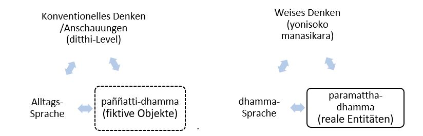 Zum »konventionellen Denken« gehören Anschauungen mit Objekten wie "Ich" und "Du", "Lebewesen", "Personen", "Männer", "Frauen", "Tiere" oder "Gesellschaft", die uns als scheinbar stabil erscheinen und damit unser konstruiertes bzw. zusammengefügtes Welt-Bild ausmachen. Aus der höheren Sicht mit Weisheit betrachtet besitzen Anschauungen - verbunden mit diesen Begriffen - keine endgültige Wahrheit und die Objekte (paññatti-dhamma), auf die sie sich beziehen, existieren nicht tatsächlich als elementare Wirklichkeit oder Entität. Ihre Seinsweise ist rein konzeptionell, nicht wirklich, d.h. fiktiv; sie sind Produkte mentaler Konstruktionen (parikappanā), keine Realitäten oder Entitäten, die aufgrund ihrer Eigennatur (sabhāva) her existieren.