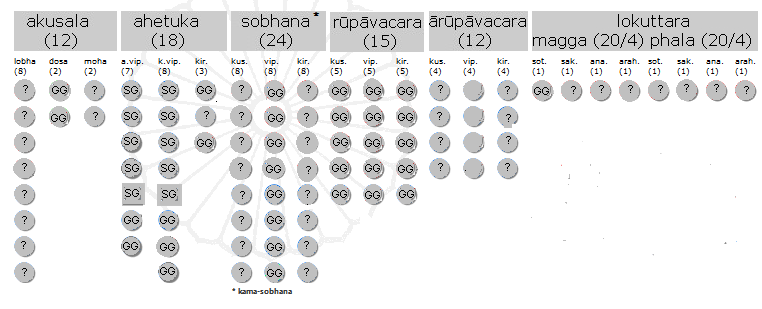 • 5 Fünfsinnesbewusstseins-Element (Sehen, Hören, usw.) [pānca-viññaṅa-dhātu: 10 cittas]